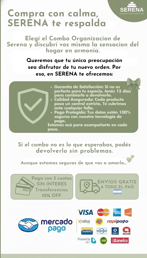 ¡Nos encanta que te sumes a esta filosofía! En SERENA creemos que ordenar es una forma de terapia. Si querés vertutoriales de doblado, ejemplos de antes y después, y leer notas profundas sobre cómo tu entorno impacta en tus emociones, te invitamos a seguirnos en nuestro Instagram @byserena.shop y a visitar nuestro Blog. Ahí compartimos contenido diario para acompañarte en el proceso.